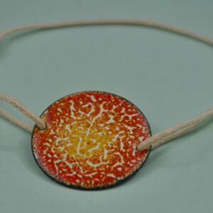 Emaillé sur une fine plaque de cuivre. Environ 30/18mm. Cordon réglable. Je déconseille pour les jeunes enfants, trop fragile pour eux.